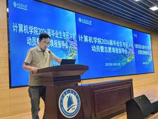 为帮助2026届考研学生深入了解考研政策与形势,科学规划报考目标,增强备考信心,计算机学院于10月10日下午在长山校区图书馆B105召开“计算机学院2026届毕业生考研冲刺动员暨志愿填报指导会”。学院全体领导班子成员、各系主任、专业负责人、青年博士教师、毕业班班主任、辅导员及2026届考研学生共同参加。会议由学院党委副书记吴健康主持。